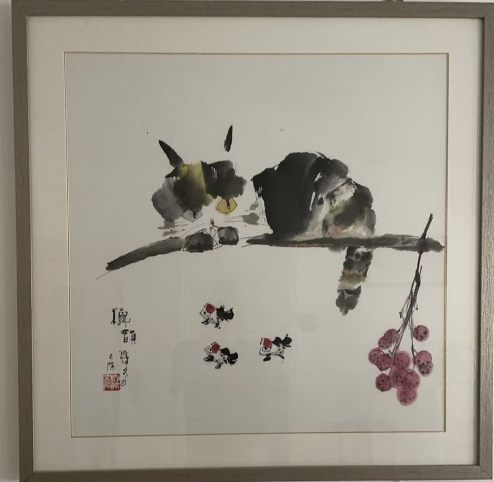 记忆中还有好多这样的猫,睡美人一样地一躺,眼睛呢?藏起来还露出一点。还有一只猫居然是立着的两只大大的眼睛金贵得像小姐,我曾经发给一位主持人看,她激动的说你怎么知道我最喜欢猫?这其实是歪打正着,我喜欢这位主持人觉得这只猫与这位主持人气质很像。我记得有一次大家伙儿聚餐变成了人人向我哥要画儿,我哥乐此不疲画一张家人拿走一张。家人乐颠儿颠颠,兴高采烈去琉璃厂订镜框又装裱,然后挂墙上。再一看那照片,真漂亮,真想抱下来尝尝。这样的太多了不胜枚举。