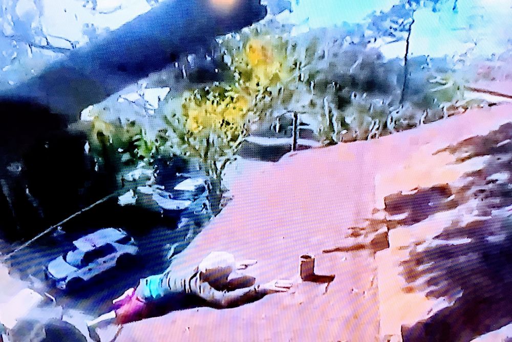 电视画面上,一个很大斜坡型的房屋顶上,一位白发苍苍老人,身体紧紧趴在这个大房顶上,画面上的他是一点点向下滑,导致两只脚滑出房檐悬空,身体还在房顶上。