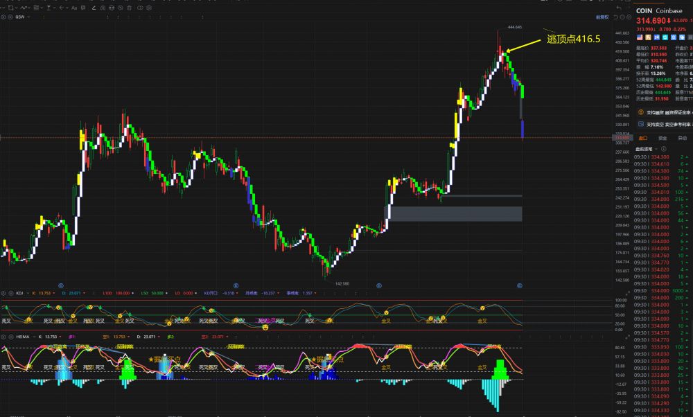 补充:COIN何时逃顶?声明,我没有买这个股票。上升阶段结束,等待道氏K线出现下一个买点。需要耐心,等待股价回到道氏K线之上。8/3/2025
