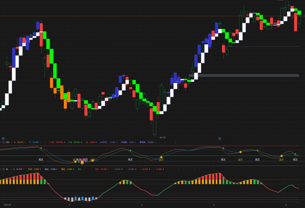 闲来无事,改进了一下程序,把表示方向的线去掉,加了逃顶的蓝色K线,也就是蓝色出现时是KDJ的J值超过95,如果掉下来,蓝色K线变红,就可以考虑减仓或者止盈,如果股价再超过蓝色K线,可以继续跟进,股价走强。同样,在下跌过程中出现橘色K线,后又消失,关注道氏K线是否在这里转折向上。下图在最后两个高点没有出现蓝色K线,说明是有两次顶背离,警惕股价下跌风险。