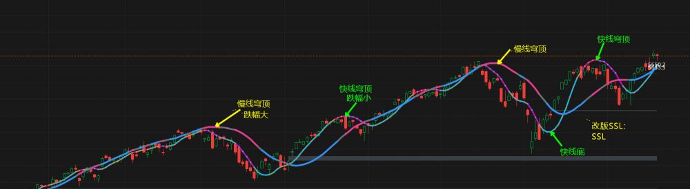 我在赫尔均线程序上加了一条慢线,经研究和回放,当慢线形成穹顶时股价调整的比较多些,快线穹顶调整浅些。抄底时,股价要在快线上面即可买入,如果股价被穹顶扣住,特别是快/慢双线同时形成穹顶,可以开始减仓或者结束波段。当然,还要结合其他超买超卖指标加强判断的可靠性。
