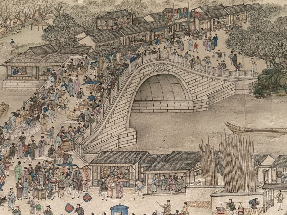 画面极密,细节却清。屋瓦成行,街巷有序,人物虽小,动作分明。马低头、船起篙、轿里人挺身,神态各异。水面几笔波光,远树点墨见风,笔笔克制,处处见匠心。
