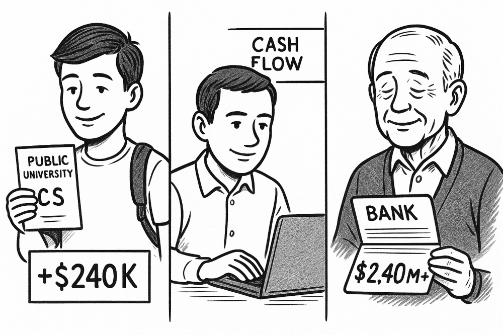18 岁去公立大学读 CS,比去藤校能省下约 24 万美元。这笔钱存在银行,长期复利,退休时可能超过 240 万,养老金有保障。