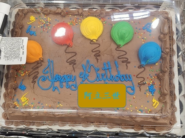 马上去拿蛋糕。蛋糕是小小阿立事先预订的,阿立三世独爱的巧克力大蛋糕,上面除了三世喜欢的装饰咚咚,当然有“阿立三世(真名隐私了)生日快乐字样”: