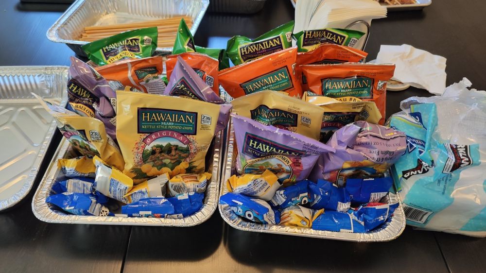 “Food was Hawaiian themed. Grilled chicken skewers, galbi, Mac salad, fruit medley(食物主题是夏威夷:烤鸡肉串,烤肉,通心粉沙拉,什锦水果)。”