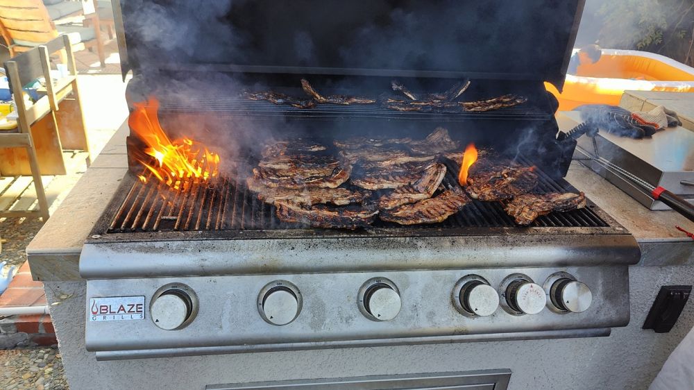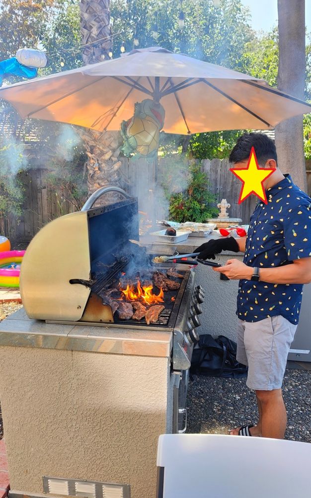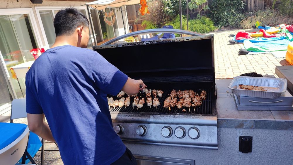 去年也是后院大烧烤庆生爬梯,那次大人孩子来了50多人。今年这次阿立三世的朋友继续增加,大人孩子足有60多人。小小阿立昨天就开始各种烤肉准备,包括米国农民烧烤特爱的串烧,切、腌了不知多少塑料袋,说:“I’m so tired(我真累趴了)。”