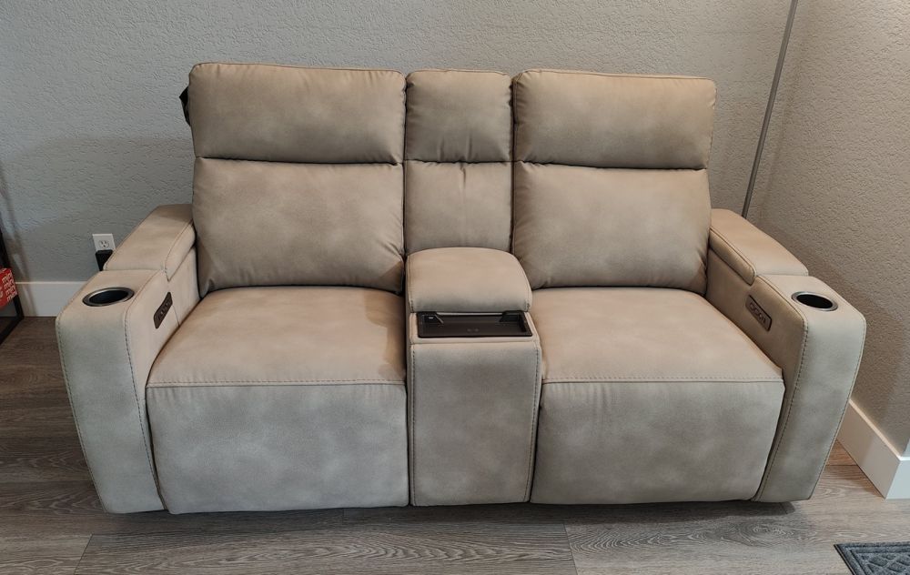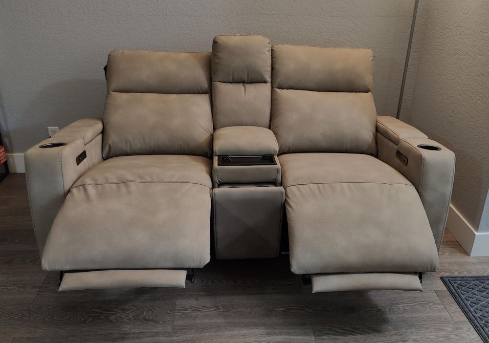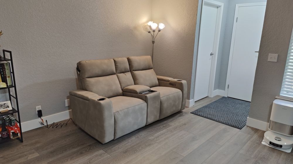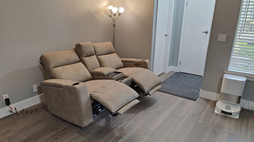 沙发位置再微调一下,接上电源。砂锅试各项操作:两个沙发靠垫、脚垫升起、放下,正常;中间的茶几垫有无线充电(wireless charger),手机放上去就开始充电(无需任何操作)。