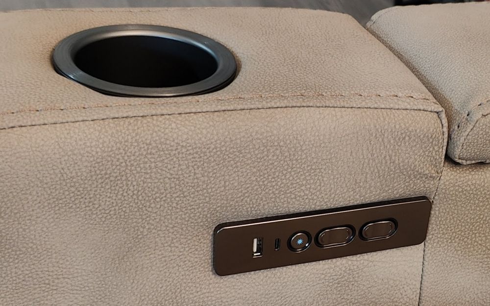 沙发两边扶手的操作按钮旁边,也有两个充电口,一个是USB-A,一个是USB-C。