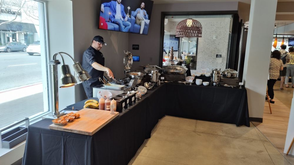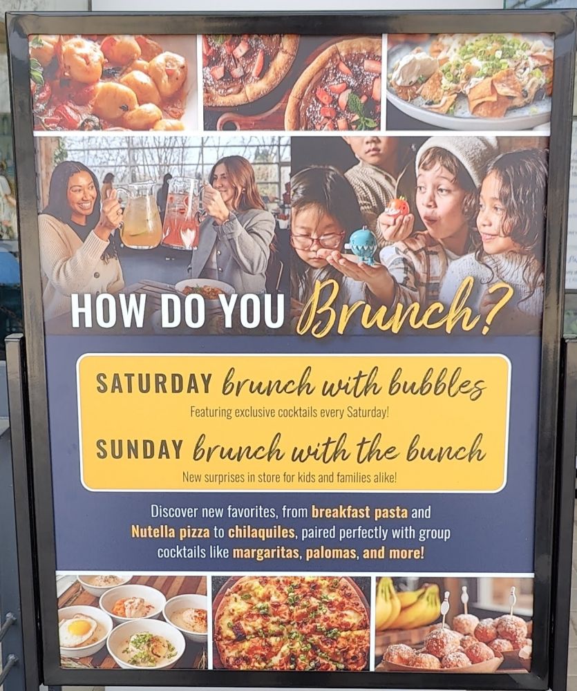三月下旬,小小阿立嫂短信,定了4月6日中午约我们和她父母一起去核桃溪市的《Pinstripes》星期天早午餐包肥:“I made a reservation for brunch buffet for all of us on Sunday, April 6th at 12:15pm at Pinstripes in downtown Walnut Creek. My parents will be here too.”