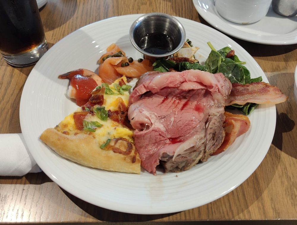 火腿培根煎蛋和猪肉早餐香肠我都尝了一口,都很好吃(米国农民标准)。