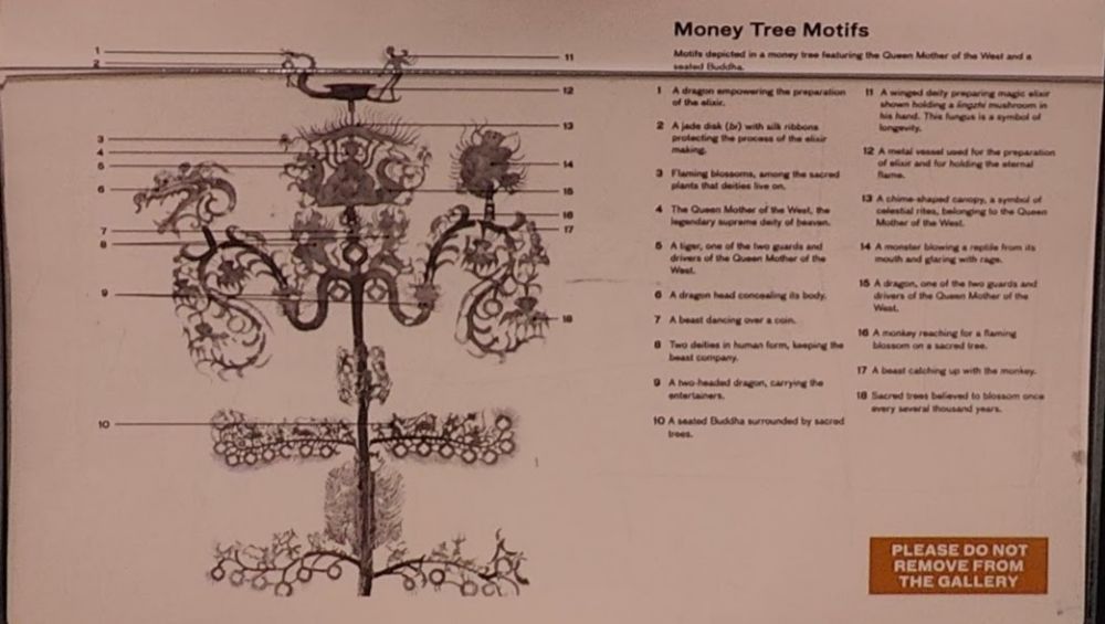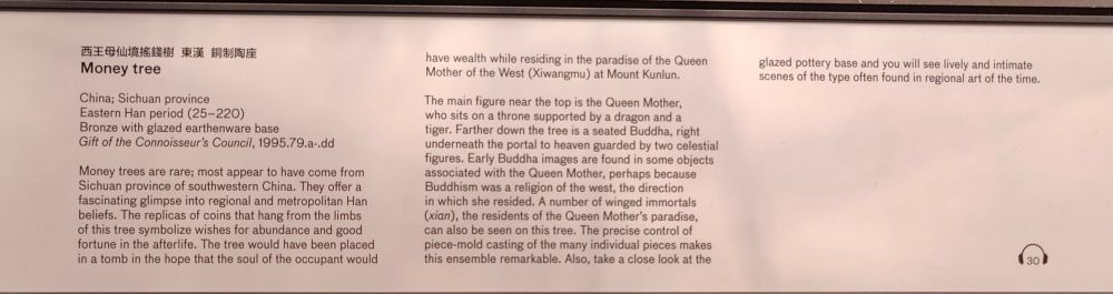 摇钱树很罕见,多数来自四川省。树上挂的铜钱象征祝愿逝者在天国的生活(afterlife)富足和好运。摇钱树是墓室陪葬,祝愿逝者在昆仑山上西王母的天堂生活富裕。