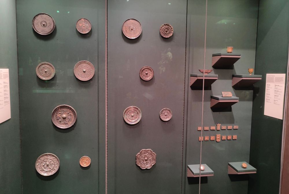 看介绍,这些铜镜的年代由西汉、东汉、战国、隋,直至唐。行色匆匆,展品介绍没有拍全,只拍到展品编号9至21,记有:西汉的星云纹镜,日月连弧纹镜;东汉的神兽镜,十二地支四灵纹镜,神人车马镜;战国的三龙镜,四山镜,四兽镜;南朝-隋代的神兽镜;唐代的狩猎纹镜,鸟兽菱花镜,海兽葡萄纹镜;以及一款铜镀金的海兽葡萄纹镜。