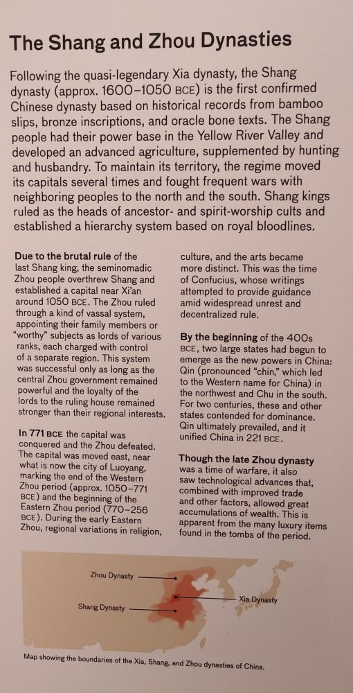 继半传奇的夏朝,商王朝(约公元前1600-1050)是中国第一个有诸如竹简、青铜铭文和甲骨文等史料佐证的王朝。兴起于黄河(中下游)的商朝发展了先进的农业,以及狩猎和畜牧业。商与南北的邻国常卷入战争,迁都频繁。商朝逐渐形成、巩固了继位的血统论(后期为典型的父死子继)。