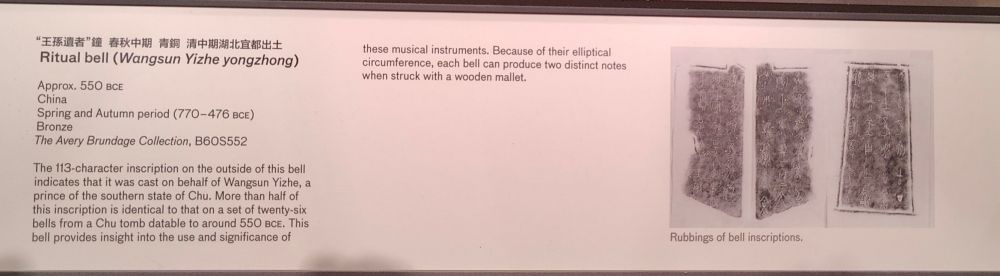 据铜钟外部的113个刻字可知,这是为南方楚国的一位王子,王孙遗者,制作的。因为铜钟的椭圆周长(elliptical circumference),每个铜钟用木槌敲击时会发出2个不同的音符。