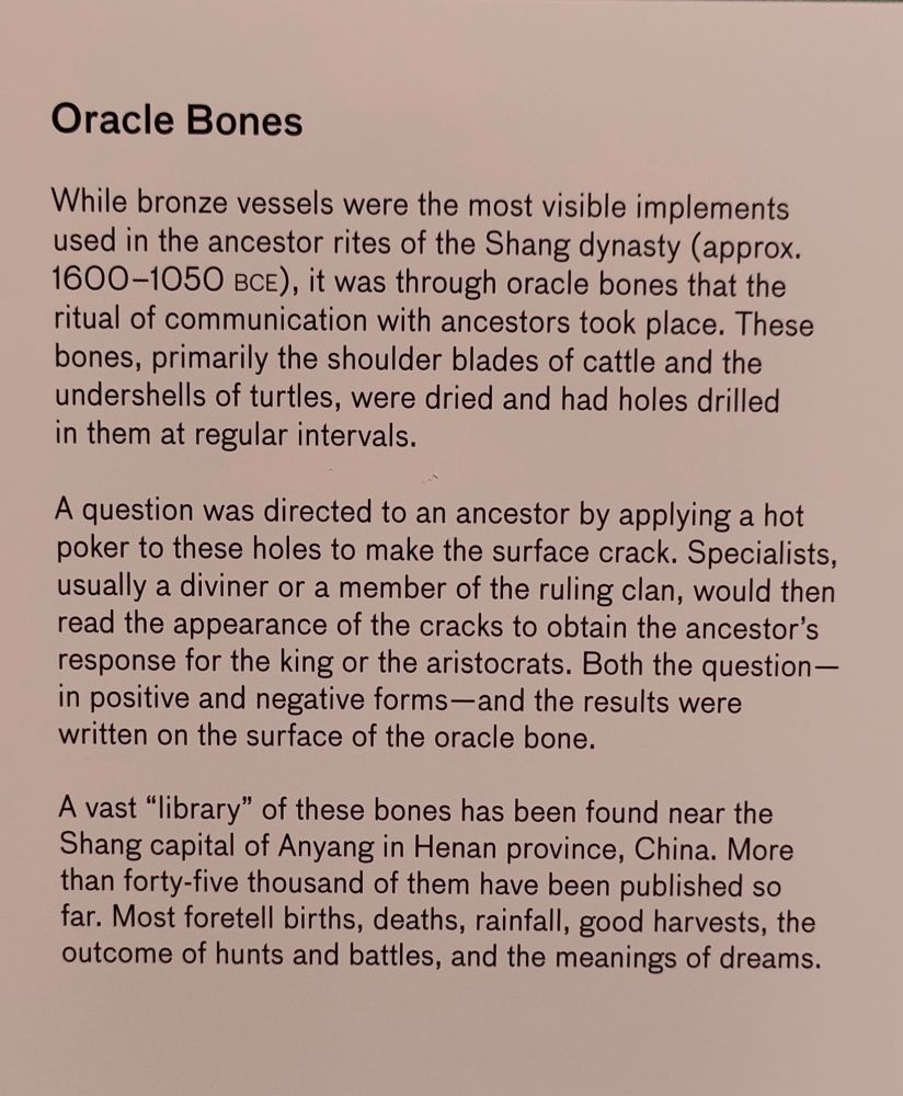 人们用烧红的拨火棍戳这些孔洞,使甲骨表面裂开,以此向祖先提出问题。专家(通常是国王或统治家族的成员)会通过观察裂纹来获取祖先的答案。问题,无论是陈述性(肯定)还是疑问,和答案都写在甲骨表面。