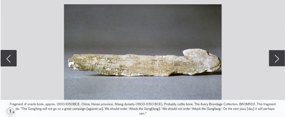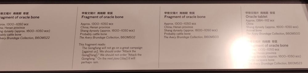 博物馆相应的甲骨文今译(英文):“The Gongfang will not go on a great campaign against us. We should order “attack the Gong[fang]”. We should not order attack the Gognfang. On the next jiaxu (day) it will perhaps rain.”