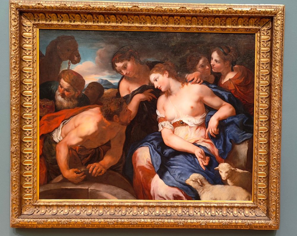 约翰·卡尔·洛特曾在家乡慕尼黑学习,后移居意大利,以卡洛托为名进行创作,并成为威尼斯最杰出的画家之一。这幅画作以标志性的宏伟人物形象,讲述了一个源自希伯来圣经的故事。雅各布将井口的石盖滚开,为拉结半裸照料的羊群取水。尽管雅各布迷恋着这位美丽的牧羊女,但她的父亲最终还是欺骗他娶了她姐姐利亚,利亚衣着朴素,正位于卡洛托画作的中心。这幅画作早期的四边都画上了条纹。