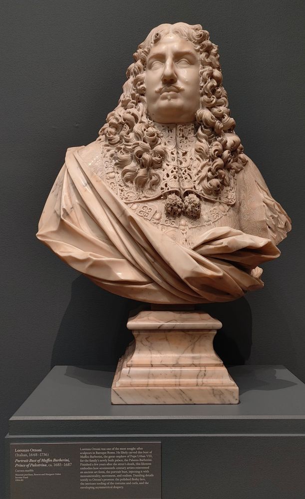 洛伦佐·奥托尼是巴洛克时期罗马最受追捧的雕塑家之一。这尊马菲奥·巴贝里尼(教皇乌尔班八世的侄孙)半身像很可能是他为家族新建的宫殿——巴贝里尼宫雕刻的。这尊肖像画在人物去世几年后完成,体现了十七世纪艺术家对半身像这一古老艺术形式的重塑,赋予其宏伟气势、动感和现实主义风格。令人眼花缭乱的细节证明了奥托尼的实力:光滑的肉质脸,服装和卷发的复杂造型,以及包裹性的不对称帷幔。