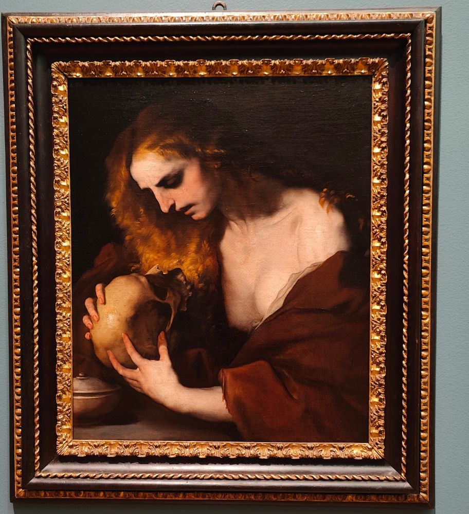 抹大拉的玛利亚凝视着一个骷髅——象征着生命的短暂和人类努力的虚空——这幅画作将灵性与感性融为一体。泪水在她的脸颊上闪闪发光,金色的头发垂落在肩上。《圣经》中,抹大拉的玛利亚是发现基督空墓的妇女之一,后来教皇格里高利一世将她描述为一位改过自新的妓女,并曾将她与伯大尼的玛利亚以及《路加福音》中用眼泪为耶稣洗脚的那位妇女相混淆。这种将圣人视为通过其善举获得救赎的罪人的理解在天主教传统中扎根,激励了一代又一代的艺术家。