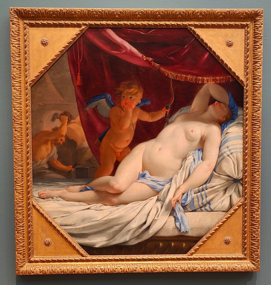 古希腊和罗马神话为巴洛克艺术家提供了丰富的情色题材。在这幅画中,爱与美的女神维纳斯沉睡在前景中,而她的伴侣火神伏尔甘则在她身后锻炉旁辛勤劳作。在他们之间,长着翅膀的丘比特将手指放在唇边,恳求我们不要吵醒他的母亲,也不要揭露她与丘比特生父马尔斯的秘密关系。然而,这个主题只是勒苏尔将一半画布用于描绘裸体的借口。鲜艳的色彩、优雅的布局和八角形的版式表明,这幅画最初装饰着巴黎的一座豪华宅邸。