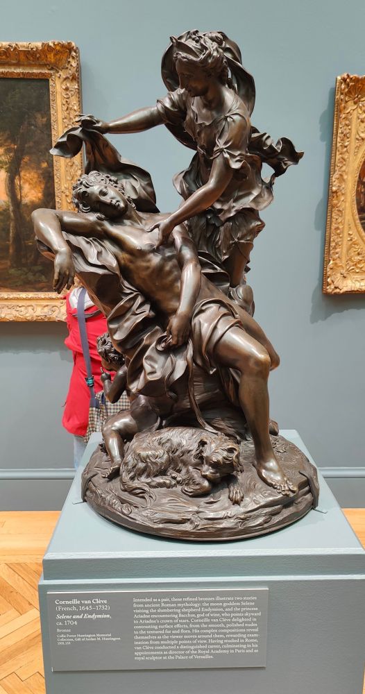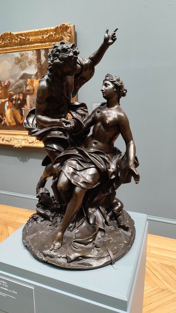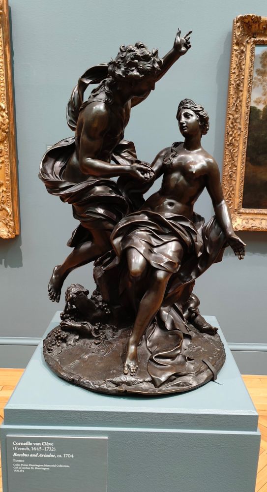 这两尊精美的青铜雕塑为一对,分别描绘了古罗马神话中的两个故事:月亮女神塞勒涅探望沉睡的牧羊人恩底弥翁,以及公主阿里阿德涅邂逅酒神巴克斯,后者指向阿里阿德涅的星辰王冠。科奈耶·凡·克莱夫热衷于对比鲜明的表面效果,从光滑抛光的裸体到富有纹理的皮毛和花卉。他复杂的构图随着观者在作品中移动而逐渐显现,值得从多个角度进行审视。范克莱夫曾在罗马学习,后来成为巴黎皇家艺术学院院长和凡尔赛宫皇家雕塑家,其职业生涯十分杰出。