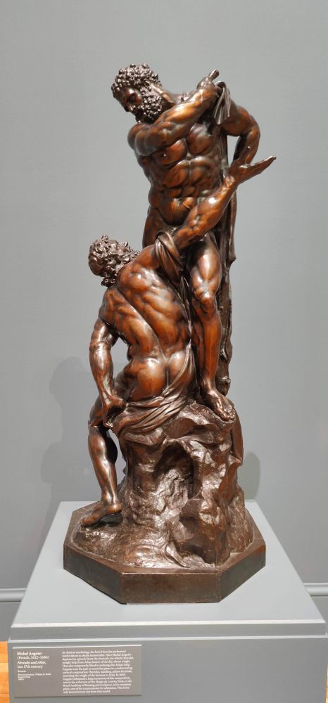 在古典神话中,英雄赫拉克勒斯完成了十二项功业以获得永生。米歇尔·安吉耶在此描绘了第十一项功业中的一个情节,赫拉克勒斯为此向掌管天空的阿特拉斯寻求帮助,阿特拉斯暂时举起了他的重量,以换取阿特拉斯的帮助。安吉耶将这对巨人塑造成肌肉发达的巨人,并以螺旋状的垂直构图呈现:赫拉克勒斯站立着,调整着斗篷,将天体的重量归还给阿特拉斯。1669年,安吉耶将一件与此构图相同的大型陶俑(现藏于巴黎卢浮宫博物馆)作为他的接待品提交给皇家绘画与雕塑学院,这是入场要求之一。这是唯一已知的以该模型铸造的青铜雕像。