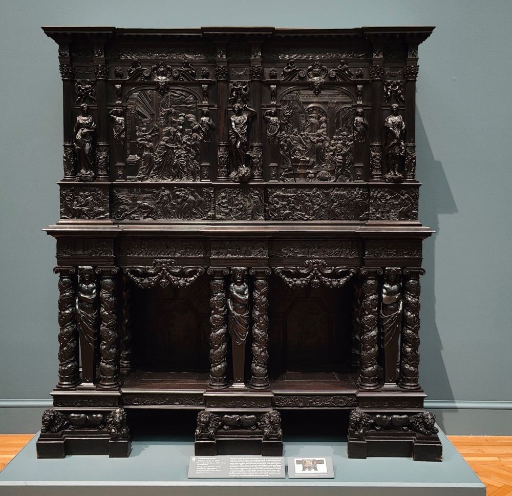 十七世纪的法国宫廷成员委托制作精美的乌木橱柜,并搭配配套的底座,作为权力和品味的象征。乌木通常从印度进口,被视为珍稀的异域木材,用于制作最尊贵的家具。这件橱柜雕刻着圣经场景和人物,旨在体现古代以色列国王所定义的良政理念。两扇主门打开,映入眼帘的是一幅戏剧性的画面,其中鎏金铜雕像正在演绎《所罗门的审判》(Judgment of Solomon),这是关于王室智慧的终极故事(the ultimate story of royal wisdom)。橱柜内部有三十多个抽屉,其中一些抽屉隐藏在装饰板后面。