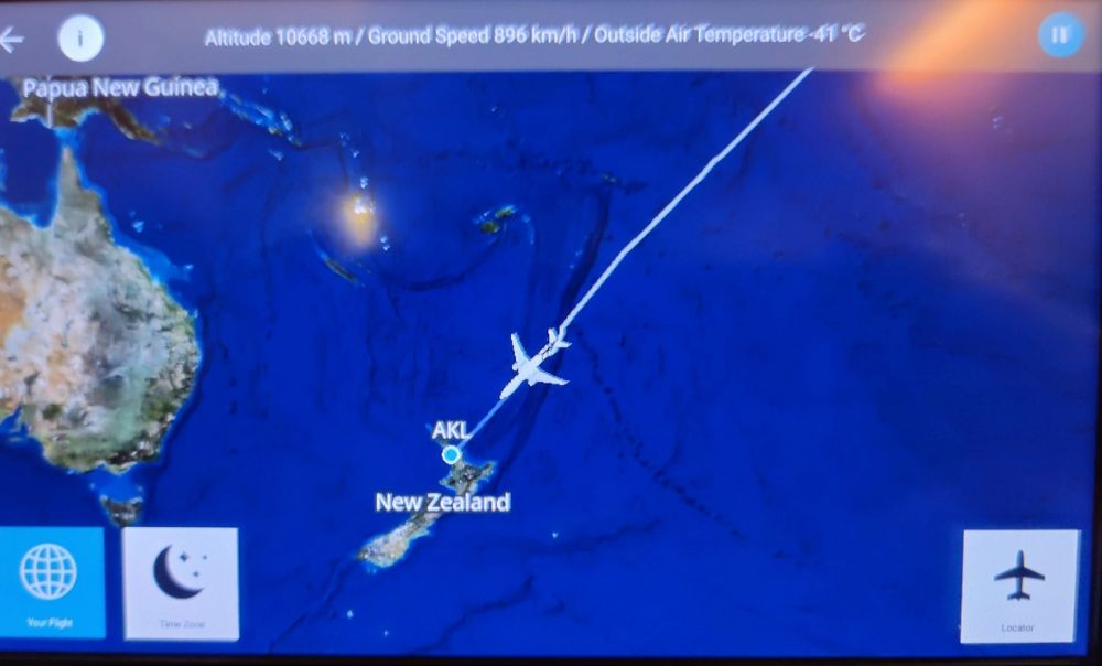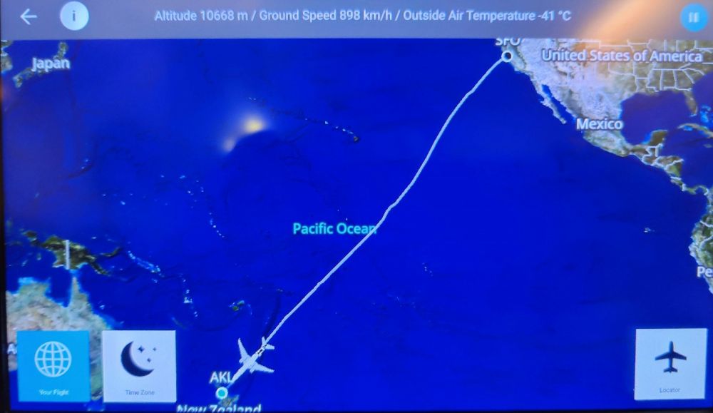旧金山和新西兰时差21个小时,似乎要飞到天涯海角去?其实不然,新西兰在太平洋中间,距离米国和中国差不多距离。我们的航班是直飞,全程直线太平洋上空横行,飞行时间13个小时都不到,并不比回国飞行时间长。