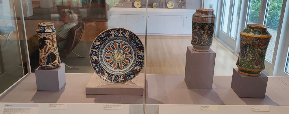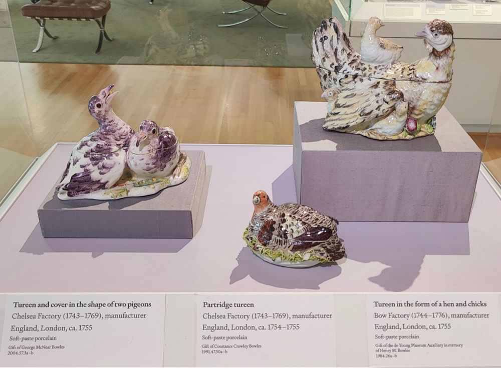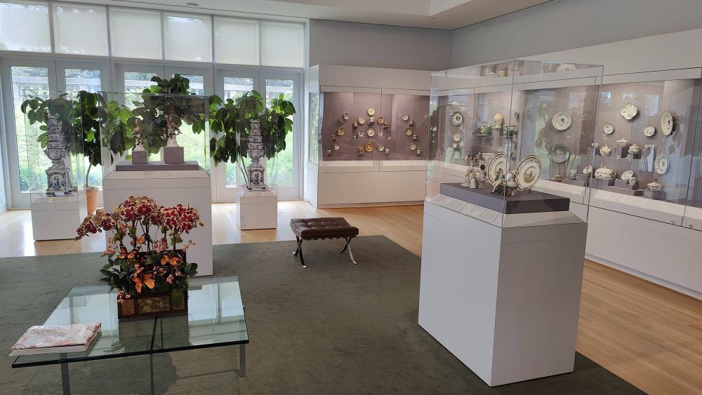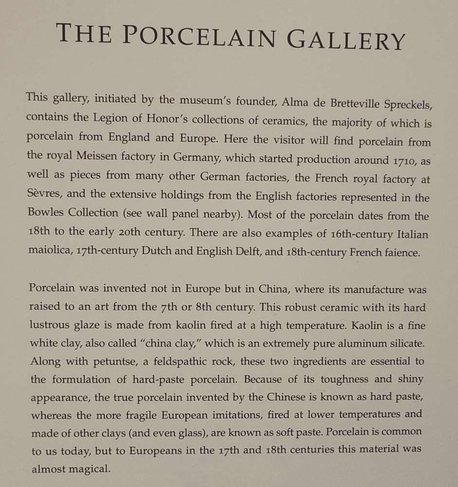 该展厅由博物馆创始人阿尔玛·德·布雷特维尔·斯普雷克尔斯(Alma de Bretteville Spreckels)发起,收藏了法国荣誉军团的陶瓷藏品,其中大部分来自英国和欧洲。参观者可以在这里看到来自德国皇家迈森工厂(the royal Meissen factory,该工厂约始于1710年)的瓷器,以及来自许多其他德国工厂、法国塞夫勒皇家工厂(the French royal factory at Sèvres)以及鲍尔斯收藏馆(Bowles Collection)的大量英国工厂藏品(见附近的墙板)。大部分瓷器的年代可追溯至18世纪至20世纪初。此外,还有16世纪的意大利陶器、17世纪的荷兰和英国代尔夫特瓷器以及18世纪的法国彩陶。