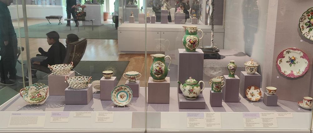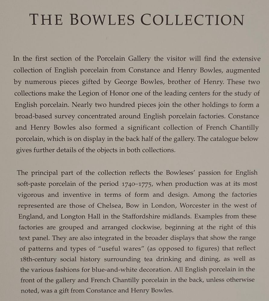在瓷器展厅的第一部分,参观者将看到康斯坦斯和亨利·鲍尔斯夫妇(Constance and Henry Bowles)收藏的大量英国瓷器,以及亨利·鲍尔斯兄弟乔治·鲍尔(George Bowles)赠送的众多藏品。这两大藏品使荣誉军团成为英国瓷器研究的领先中心之一。近两百件藏品与其他藏品共同构成了以英国瓷器工厂为中心的广泛收藏。康斯坦斯和亨利·鲍尔斯夫妇还收藏了大量法国尚蒂伊瓷器(French Chantilly porcelain),这些瓷器在展厅的后半部分展出。下方的图录详细介绍了这两个藏品系列。