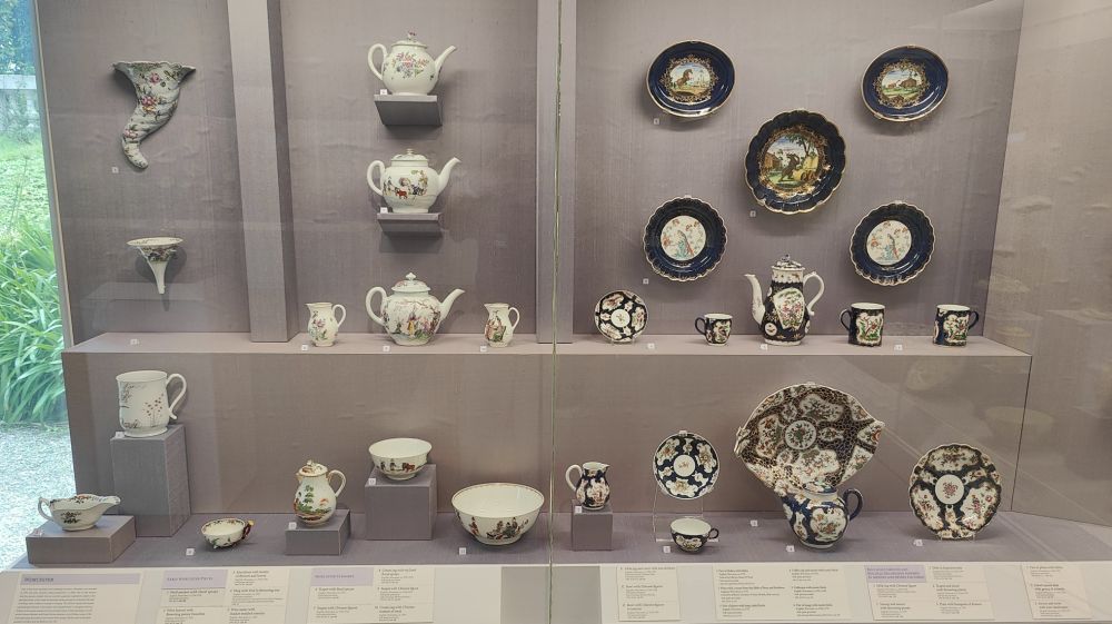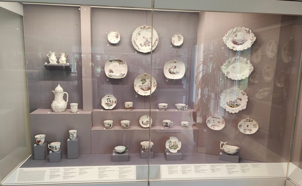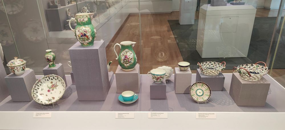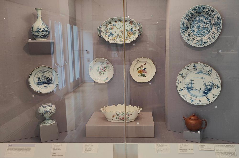 藏品的主要部分反映了鲍尔斯夫妇对1740年至1775年间英国软瓷(soft-paste porcelain)的热爱,当时的软瓷生产在形式和设计方面最为活跃,也最具创造力。这些工厂包括切尔西(Chelsea)、伦敦的弓箭工厂(Bow Factory)、英格兰西部的伍斯特(Worcester)以及斯塔福德郡中部地区(Staffordshire midlands)的朗顿霍尔(Longton Hall)。这些工厂出品的瓷器样本按顺时针方向分组排列,从此文字板右侧开始。它们也融入了更广泛的展陈中,这些展陈展示了各种图案和类型的“实用器皿”(而非人物),反映了18世纪围绕饮茶和餐饮(tea drinking and dining)的社会历史,以及各种青花装饰(blue-and-white decoration)的时尚。除非另有说明,展厅正面的所有英国瓷器和背面的法国尚蒂伊瓷器均为康斯坦斯和亨利·鲍尔斯夫妇的赠礼。