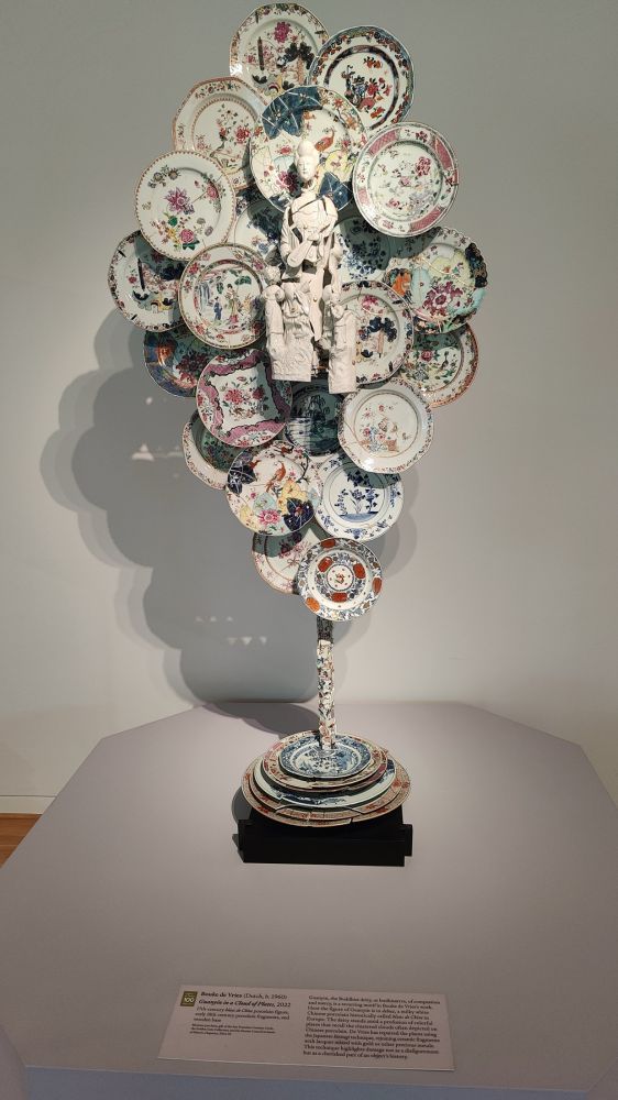 观音,佛教神灵,慈悲的菩萨,是布克·德·弗里斯作品中反复出现的主题。这尊观音像盛放在德化瓷(dehua)中,德化瓷是一种乳白色的中国瓷器,在欧洲历史上被称为中国白瓷(blanc de Chine)。观音像矗立在众多色彩斑斓的盘子之中,令人联想起中国瓷器上常见的云朵图案。德·弗里斯运用日本金缮技法(Japanese kintsugi technique)修复了这些盘子,用掺有金或其他贵金属的漆料将陶瓷碎片重新粘合在一起。这种技术对陶瓷损伤(damage)强调的不是破碎(disfigurement),而是物体历史中珍贵的一部分(cherished part of an object's history)。