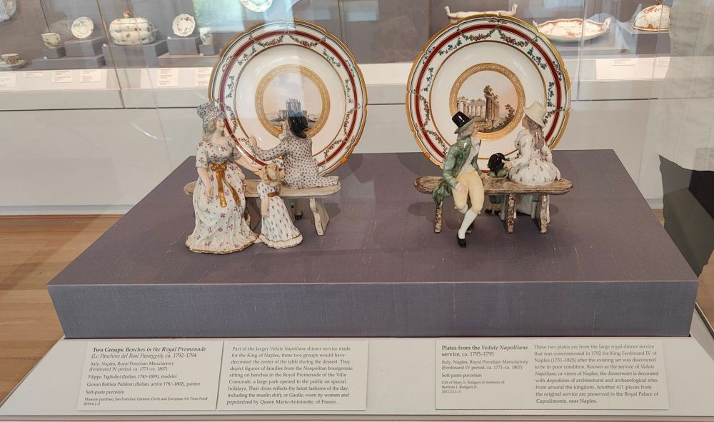 这两组作品是那不勒斯国王享用的大型Vedute Napolitane晚宴的一部分,在甜点时间装饰餐桌中央。它们描绘了那不勒斯资产阶级家庭的人物形象,他们坐在维拉科穆纳莱(Vila Comunale)皇家长廊的长椅上,维拉科穆纳莱是一个大型公园,在特殊节日向公众开放。她们的服饰反映了当时最新的时尚,包括女性穿着的平纹细布衬衣(the muslin shift),又称“高乐”(Gaulle),这种服装由法国王后玛丽·安托瓦内特(Queen Marie-Antoinette)推广。