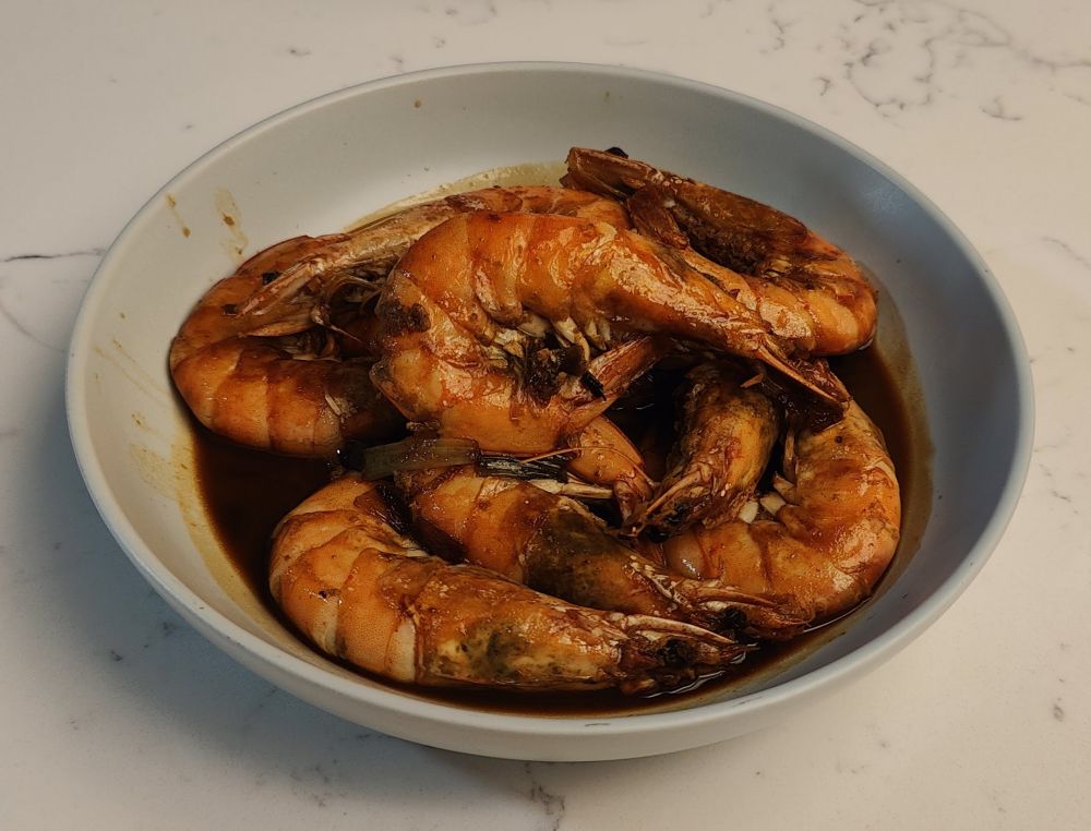 阿立嫂后来加了一只菜:红烧大白虾,考试特抠买的大白虾(White Shrimp)。