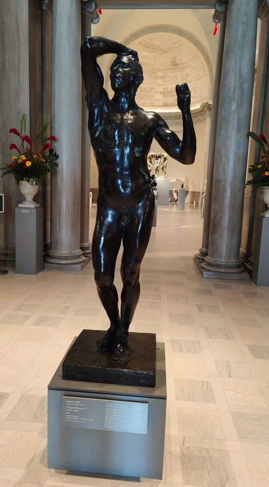 “这尊裸体雕塑仿佛从永恒的沉睡中苏醒,是罗丹创作的第一尊真人大小的雕像。1877年,罗丹在国家主办的年度展览——沙龙展上展出了这尊雕塑。沙龙展的标题指的是古代诗人赫西奥德所构想的人类五个时代(黄金时代、白银时代、青铜时代、英雄时代和铁器时代)中的第三个时代。雕塑栩栩如生,引发了罗丹直接在模特身上塑形的争议——这种技法在当时被视为作弊。荣誉军团的联合创始人阿尔玛·德·布雷特维尔·斯普雷克尔斯在1915年旧金山举办的巴拿马太平洋国际博览会上展出后,购得了这尊雕塑的铸模。”
