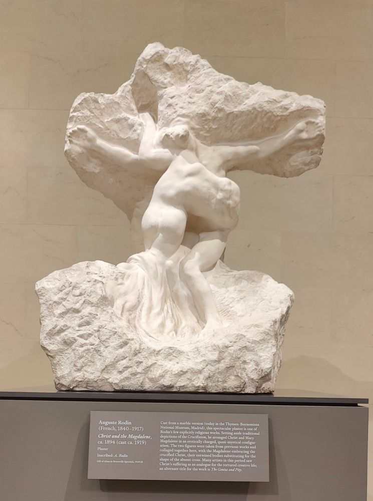 这件壮观的石膏雕塑,以大理石版本铸造而成(现藏于马德里提森-博内米萨国家博物馆),是罗丹为数不多的明确带有宗教色彩的作品之一。他摒弃了传统的耶稣受难描绘,将基督和抹大拉的玛利亚安排成一种充满情色意味、近乎神秘的姿态。
