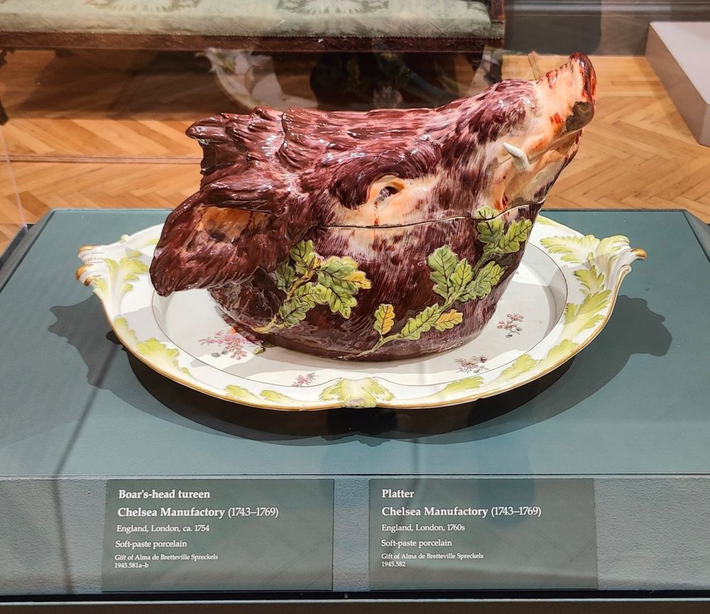 《野猪头盖碗》和《浅盘》,软质瓷器,切尔西制造厂(Chelsea Manufactory),英国,伦敦,约1754年。