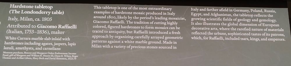 此桌面是1800年左右意大利制作的最非凡的硬石马赛克作品之一,很可能出自当时最杰出的马赛克艺术家贾科莫·拉斐尔之手。将色彩鲜艳、图案丰富的硬石切割成马赛克的传统可以追溯到古代,但拉斐尔引入了一种全新的方法,将精心排列的几何图案排列在白色大理石地面上。这块桌面在米兰制作,采用了来自意大利以及更远的德国、波兰、俄罗斯、埃及和阿富汗等地的各种珍贵宝石,体现了地质学和宝石学等科学领域的蓬勃发展。它也展现了欧洲装饰艺术的全球化维度,其材料的稀缺性反映了其赞助人高雅而精致的品味,而对拉斐尔来说,这些赞助人包括沙皇、国王和皇帝。