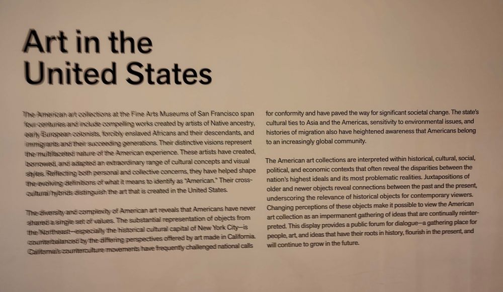 旧金山美术博物馆的美国艺术藏品横跨四个世纪,囊括了原住民、早期欧洲殖民者、被奴役的非洲人及其后裔以及移民及其后代艺术家创作的引人入胜的作品。他们独特的视角展现了美国经历的多面性。这些艺术家创造、借鉴并改编了丰富多样的文化概念和视觉风格。他们反映了个人和集体的关切(both personal and collective concerns),帮助塑造了“美国人”身份认同的不断演变的定义(what it means to identify as “American”)。他们的跨文化融合使美国艺术独具特色。