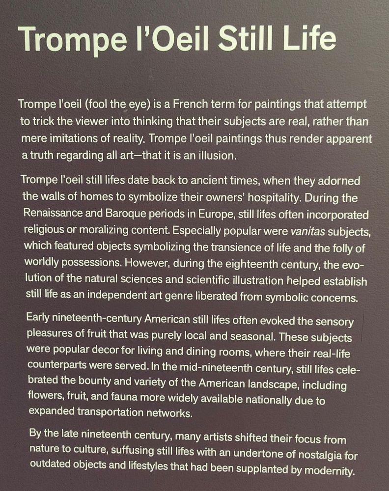 错视静物画起源于古代,当时人们在家中装饰墙壁,象征着主人的热情好客。在欧洲的文艺复兴(Renaissance)和巴洛克(Baroque)时期,静物画常常融入宗教或道德内容(religious or moralizing content)。其中尤为流行的是虚空派题材(vanitas subjects),其作品象征着生命的短暂(transience of life)和世俗财富的愚昧(folly of worldly possessions)。然而,在18世纪,自然科学和科学插画的发展,帮助静物画成为一种独立的艺术流派(independent art genre),摆脱了对象征性事物的过度关注(symbolic concerns)。