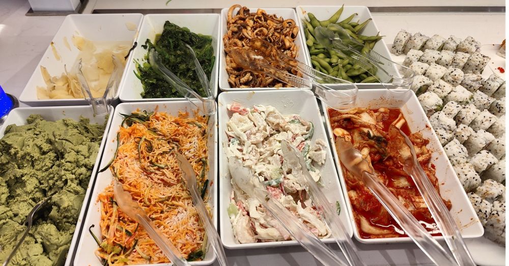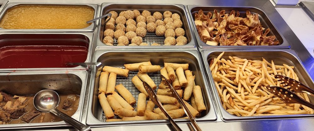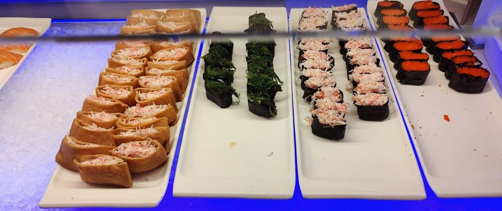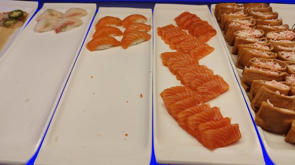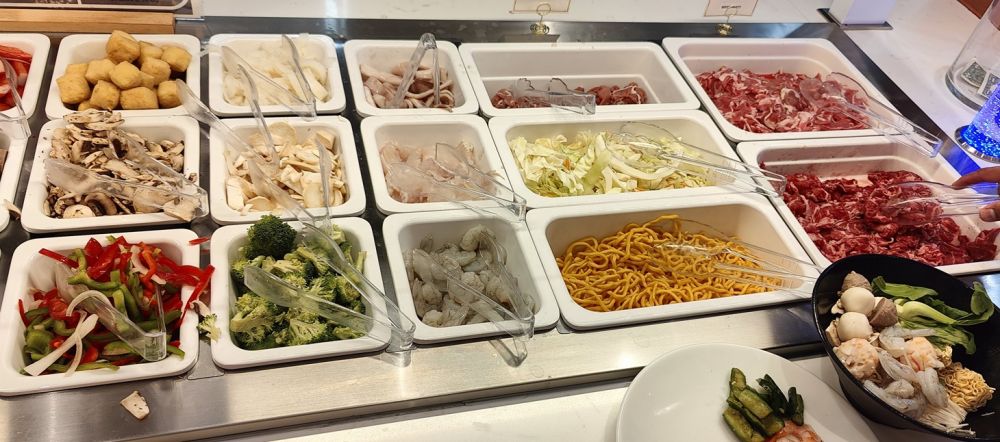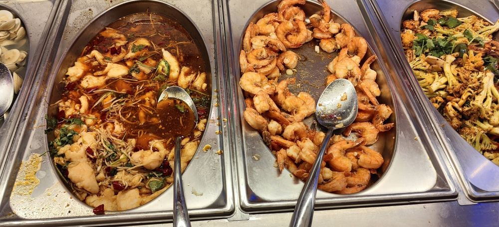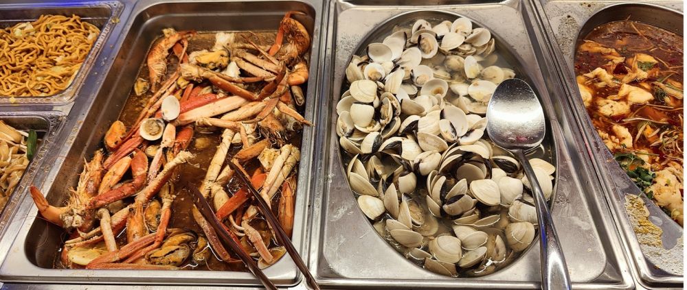 这家海鲜包肥比我们今年6月份去吃的《融合包肥》(Fusion Buffet)贵不少,号称有几个优势:海鲜更多、且有日式生鱼片(而不是限于寿司);有自选食材、厨师现做的麻辣烫;除了寻常软饮料,还有店家自制的奶茶和瓶装冰茶、特色冰饮料。。。