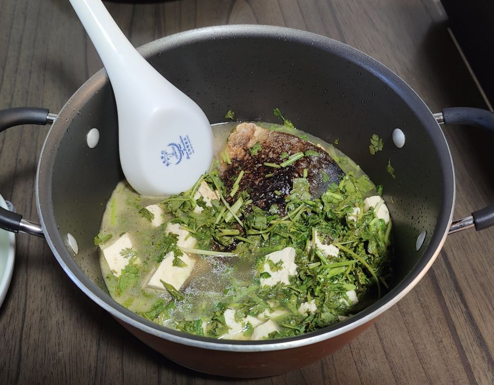 再来一锅豆腐炖琥珀鱼(Amberjack),熄火后再加些香菜: