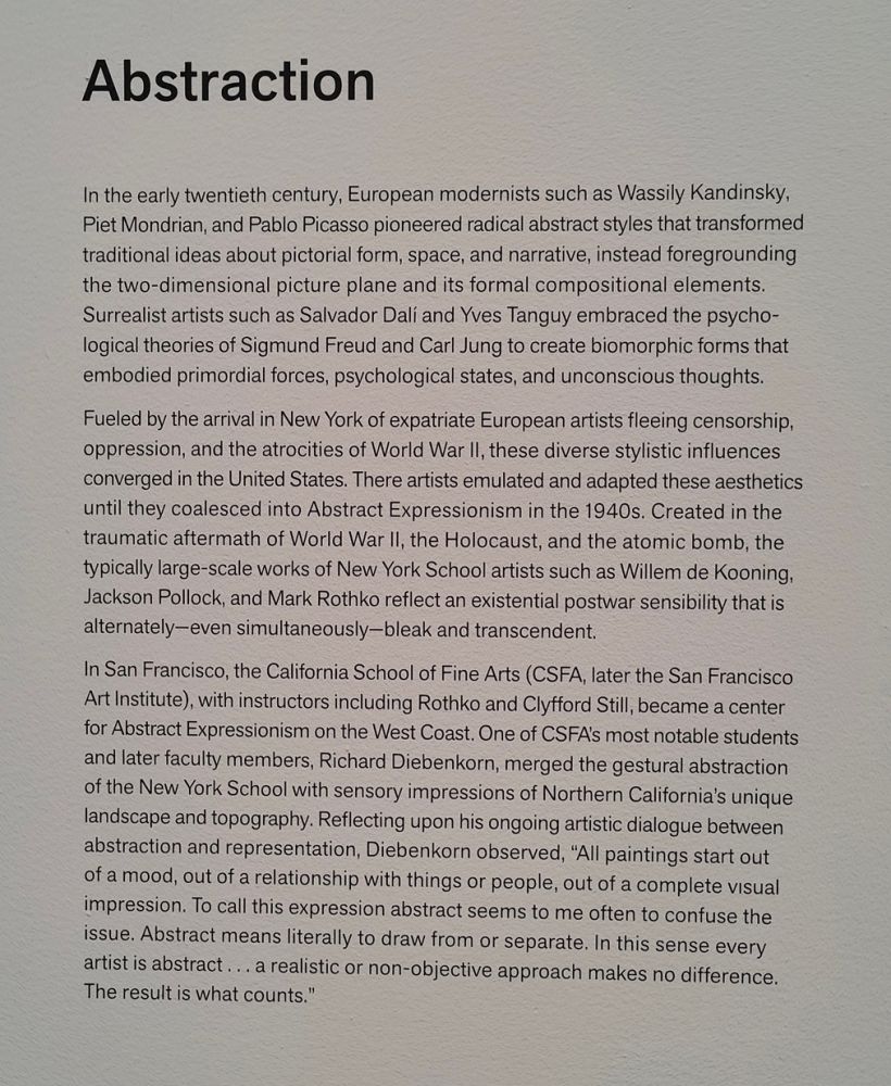 在旧金山,加州美术学院(CSFA,后来的旧金山艺术学院,SFAI)在罗斯科和克莱福德·斯蒂尔(Clyfford Still)等导师的指导下,成为了西海岸抽象表现主义的中心。加州美术学院最著名的学生之一、后来的教员理查德·迪本科恩(Richard Diebenkorn)将纽约画派的姿态抽象(gestural abstraction)与北加州独特景观和地形(topography)的感官印象融合在一起。回顾自己在抽象与具象之间持续进行的艺术对话,迪本科恩评论道:“所有绘画都源于一种情绪(mood),源于与事物或人物的关系,源于一种完整的视觉印象(complete visual impression)。在我看来,将此称为表达抽象(expression abstract)常常会混淆问题。抽象的字面意思是汲取或分离。从这个意义上讲,每个艺术家都是抽象的。写实或非写实的创作手法并不重要。重要的是结果。”