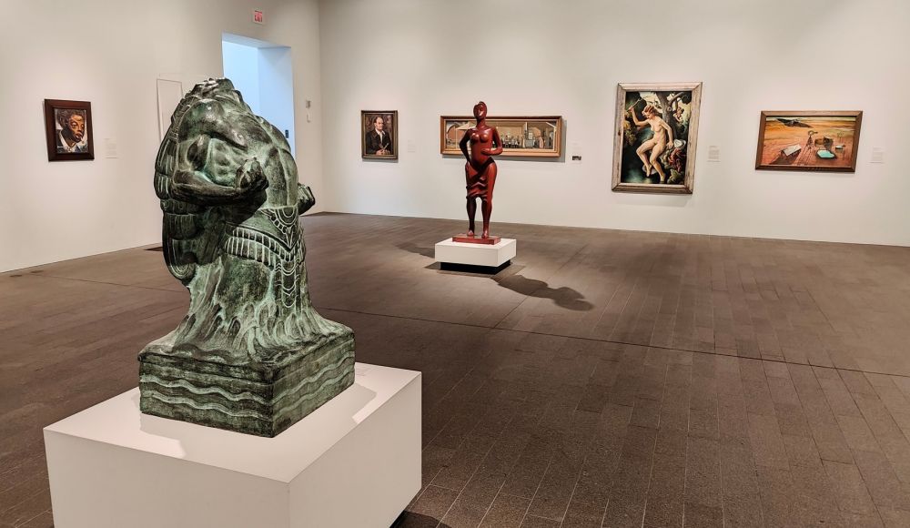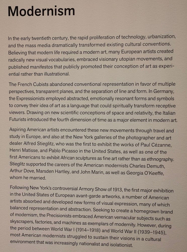 有抱负的美国艺术家通过在欧洲旅行和学习接触到了这些新运动,同时也在摄影师兼艺术品经销商阿尔弗雷德·斯蒂格里茨(Alfred Stieglitz)的纽约画廊中接触到了这些新运动。斯蒂格里茨是第一个在美国展出保罗·塞尚(Paul Cézanne)、亨利·马蒂斯(Henri Matisse)和巴勃罗·毕加索(Pablo Picasso)作品的人,也是第一个将非洲雕塑作为纯艺术而非人种学(ethnography)展览的美国人之一。斯蒂格里茨支持了美国现代主义者查尔斯·德穆斯(Charles Demuth)、亚瑟·多夫(Arthur Dove)、马斯登·哈特利(Marsden Hartley)和约翰·马林(John Marin)以及他与之结婚的乔治亚·奥基夫(Georgia O'Keeffe)的事业。1913 年,纽约军械库艺术展(Armory Show)备受争议,这是美国首次举办欧洲前卫艺术作品(European avant-garde artworks)大型展览。此后,许多美国艺术家吸收并发展了新的视觉表达形式,其中许多形式在具象与抽象之间取得了平衡。严谨主义派(Precisionists)力求打造本土化的现代主义风格,他们以摩天大楼、工厂和机器等美国本土元素作为现代性的典范。然而,在第一次世界大战(1914-1918)和第二次世界大战(1939-1945)期间,大多数美国现代主义者在民族主义(nationalist)和孤立主义(isolationist)日益盛行的文化环境中,难以维持自己的愿景。