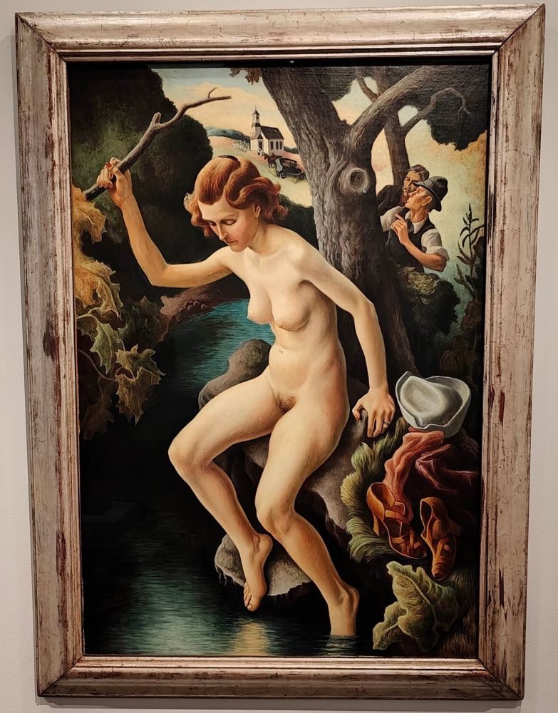 托马斯·哈特·本顿(Thomas Hart Benton)的《苏珊娜与长老》取材于一则伪经圣经故事(Apocryphal biblical narrative),故事中两位长老在已婚女子苏珊娜沐浴时设陷阱。当她拒绝他们的性要求时,他们诬告她通奸。直到先知丹尼尔(Daniel)从指控者那里得到相互矛盾的证词,苏珊娜才得以逃脱,而指控者随后被判处死刑。通过将画中人物描绘成当代密苏里人(留着小胡子的人物是艺术家的自画像),本顿将这个故事转化为对他所认为的圣经地带(Bible Belt)宗教的道德虚伪(moral hypocrisy)和压抑性欲(repressed sexuality)的批判。