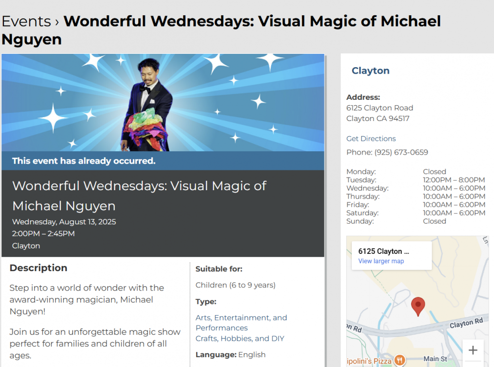 小小阿立嫂早早查好,今天下午克雷顿图书馆有一个阮大师的魔术秀。