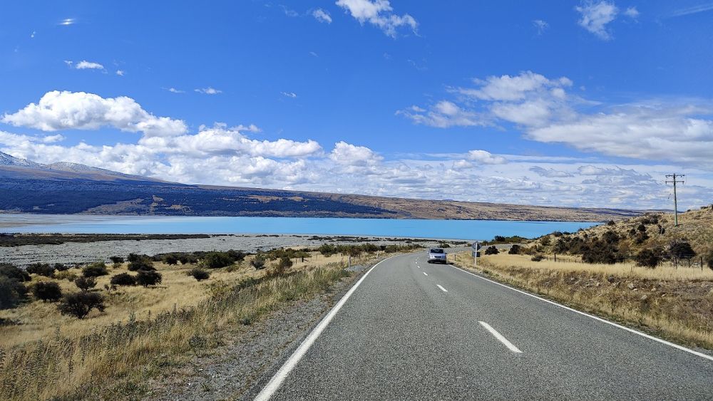 告别库克山,天舒哥驾着8人座大奔驰在库克山路(Mt Cook Road)上凯旋而归。一路沿着时隐时现的牛奶湖。。。