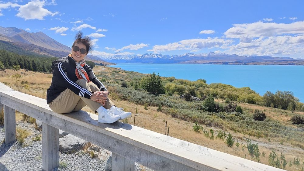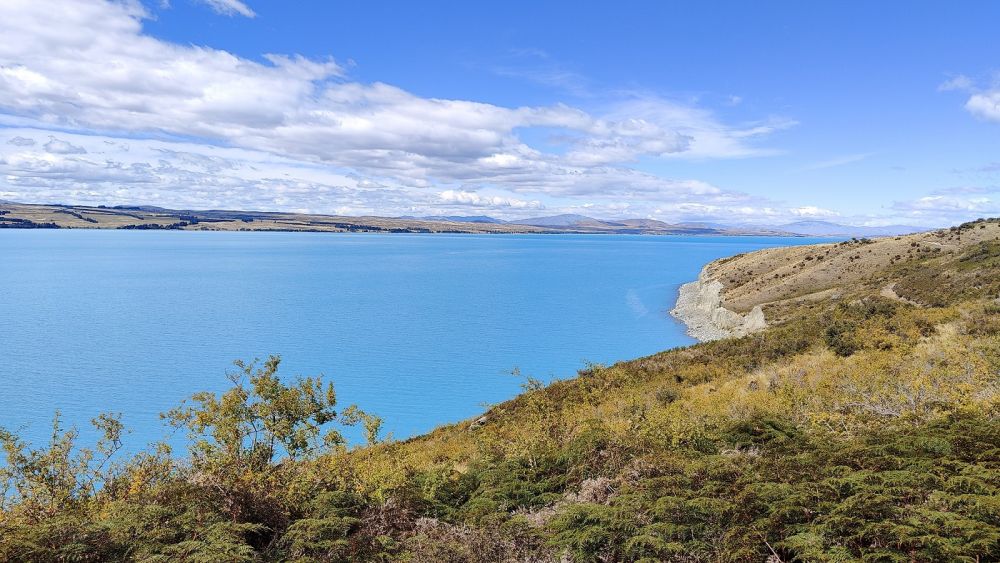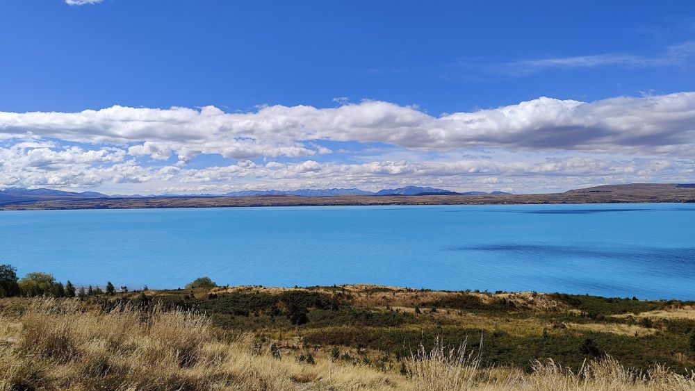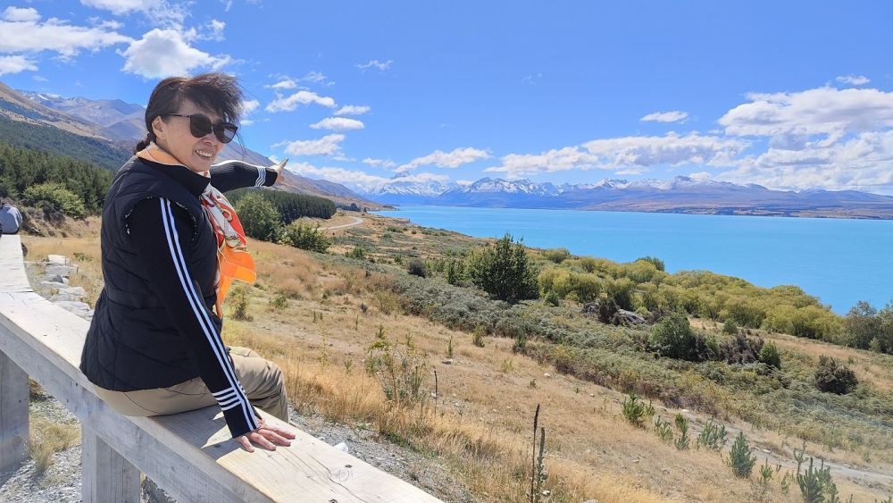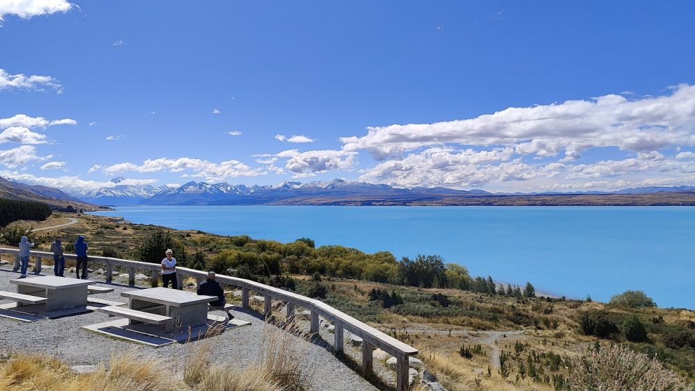 问谷歌:库克山路上的彼得瞭望台是欣赏新西兰最佳路景的绝好去处(之一)。放眼四望,库克山路沿着绿松石色的普卡基湖(Lake Pukaki),优雅地在本奥毫山脉下蛇形潜行(Peters Lookout on the scenic road to Mount Cook offers one of the best road views in New Zealand. From the viewpoint, Mt Cook Road gently snakes its way underneath the Ben Ohau Range, just beside the turquoise-coloured Lake Pukakai)。