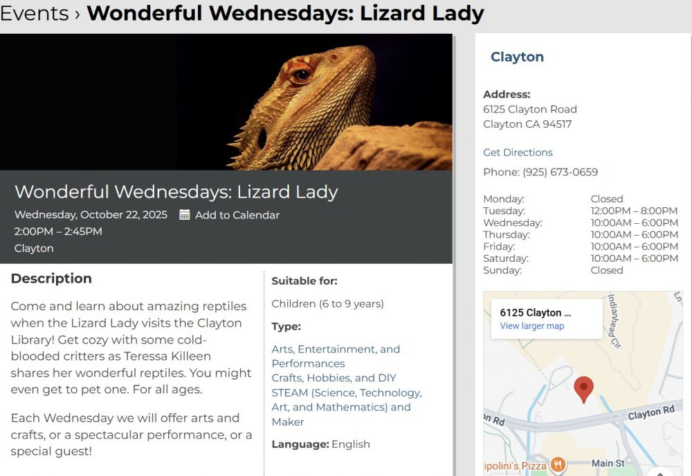 星期二小小阿立嫂提供信息(英文略,大意):“阿立三世想去克莱顿图书馆。他们的周三兴趣活动(Wonderful Wednesday)是Lizard Lady(蜥蜴女士)。”