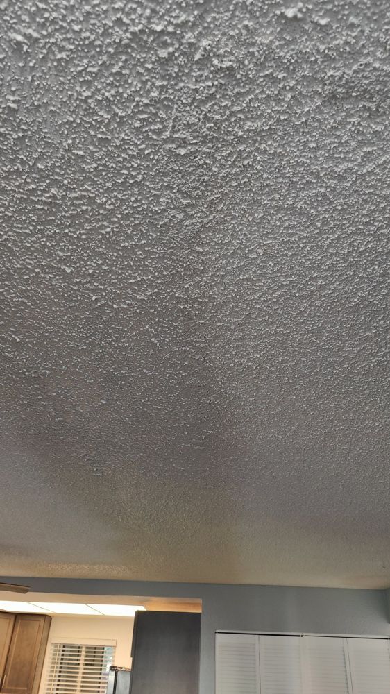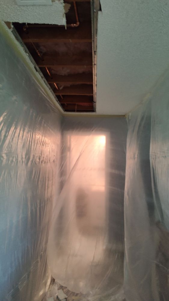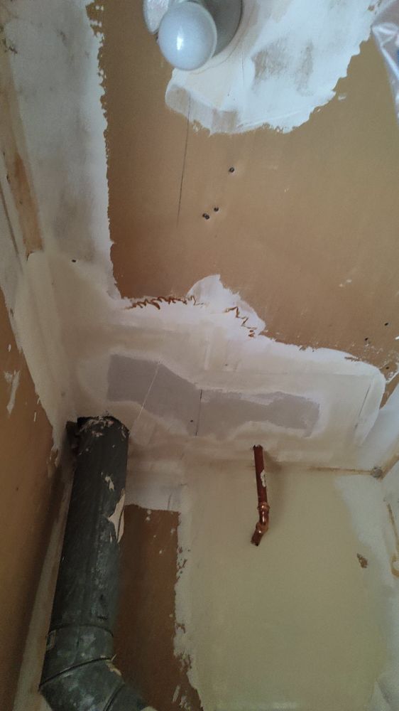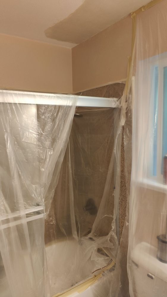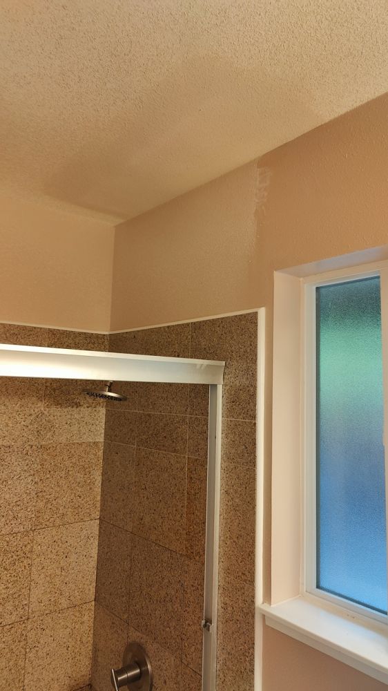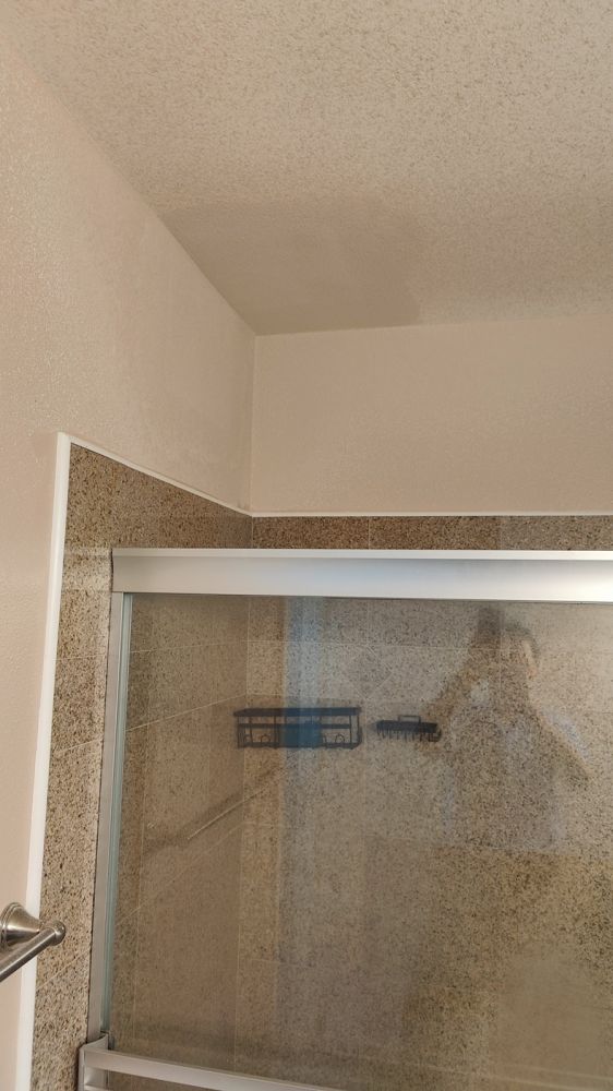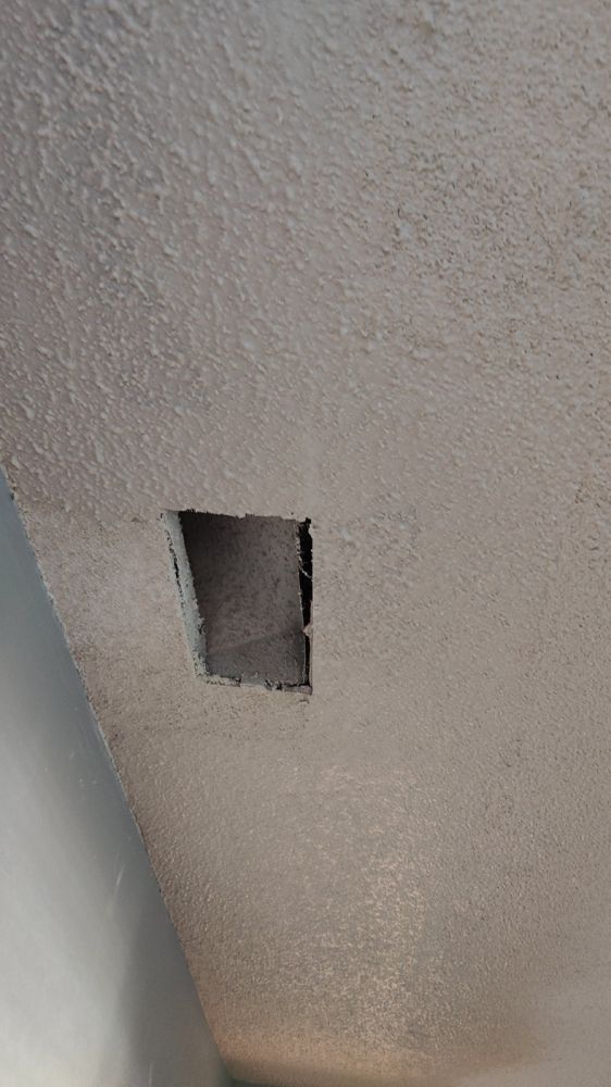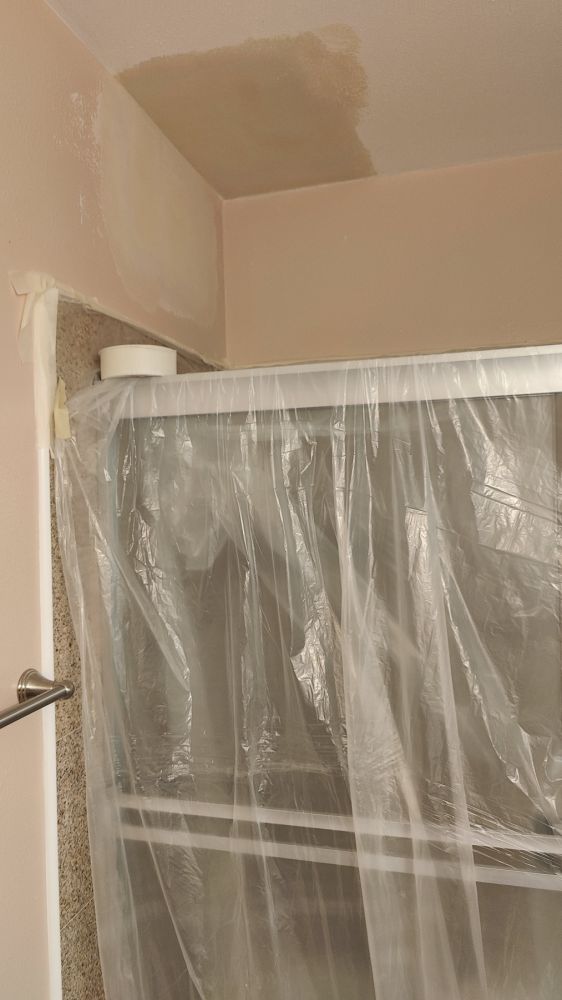 今天邻居中东老太太安排了南美大叔来给我们修补板岩(sheet rock):起居室(living room)、过道(hallway)、主卧室、主卧室卫浴室、客用卫浴室(Guest Bathroom)、厨房、后院储藏室(热水器室)所有被大割礼的天花板、墙板。